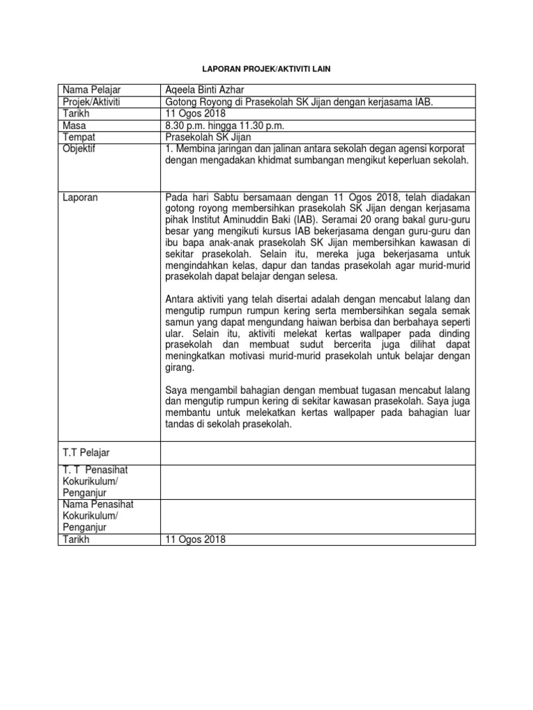Laporan Aktiviti Kokurikulum Gotong Royong Preschool Pdf